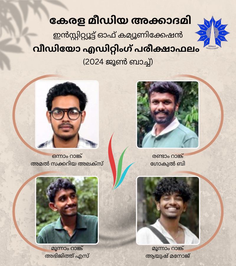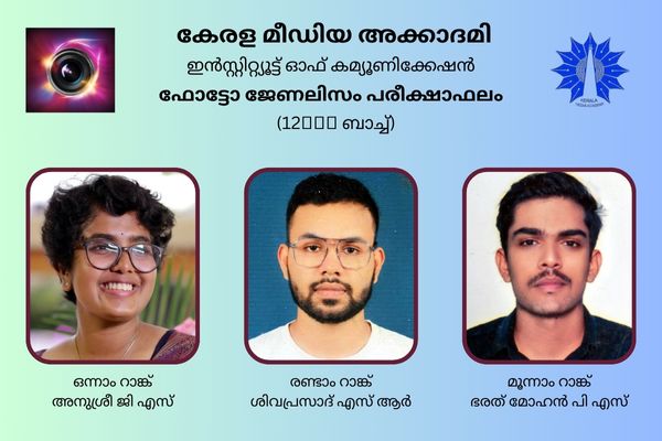 കേരള മീഡിയ അക്കാദമി ഇന്സ്റ്റിറ്റ്യൂട്ട് ഓഫ് കമ്യൂണിക്കേഷന് 12-ാം ബാച്ച് ഫോട്ടോജേണലിസം ഡിപ്ലോമ കോഴ്സിന്റെ പരീക്ഷാഫലം പ്രഖ്യാപിച്ചു. അക്കാദമി തിരുവനന്തപുരം സെന്ററിലെ അനുശ്രീ ജി.എസ് ഒന്നാം റാങ്കിനും ശിവപ്രസാദ് എസ്.ആര് രണ്ടാം റാങ്കിനും കൊച്ചി സെന്ററിലെ ഭരത് മോഹന് പി.എസ് മൂന്നാം റാങ്കിനും അര്ഹരായി. കോഴിക്കോട് എടക്കര അനുഗ്രഹത്തില് ഗോപാലന്കുട്ടിയുടെയും സി. ശാരദയുടെയും മകളാണ് ഒന്നാം റാങ്ക് നേടിയ അനുശ്രീ ജി.എസ്. തിരുവനന്തപുരം പുളിയറക്കോണം ആനന്ദ് ഭവനില് കെ.സി. ശിവന്കുട്ടിയുടെയും പി രേണുകയുടെയും മകനാണ് രണ്ടാം റാങ്ക് നേടിയ ശിവപ്രസാദ് എസ്.ആര്. മൂന്നാം റാങ്ക് നേടിയ ഭരത്മോഹന് പി.എസ് തൃശൂര് ത്രിവേണി പോണത്ത് വീട്ടില് സുരേഷിന്റെയും ദീപയുടെയും മകനാണ്.